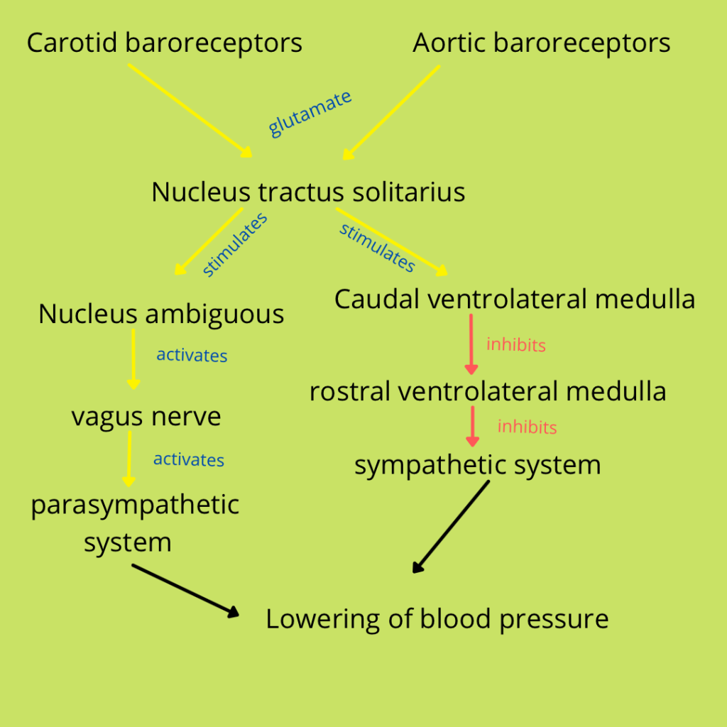 When blood pressure increases, baroreceptors are activated leading to the release of the excitatory neurotransmitter, glutamate. The signals reach the nucleus tractus solitarius, which stimulates both the nucleus ambiguous and caudal ventrolateral medulla. Stimulation of the nucleus ambiguous leads to the activation of the parasympathetic system. And stimulation of the caudal ventrolateral medulla inhibits the rostral ventrolateral medulla through the inhibitory neurotransmitter, GABA, leading to inhibition of the sympathetic system. These lead to the consequent lowering of blood pressure.