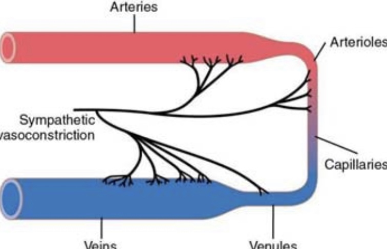Sympathetic stimulation of the arteries and arterioles increases peripheral resistance. Sympathetic stimulation of the veins constricts them, thus squeezing extra blood into the circulation (as veins are the reservoirs of blood). Sympathetic nerves also directly innervate the heart. Upon sympathetic stimulation, the heart contracts more forcefully. Hence, due to all these effects, sympathetic stimulation acts to increase blood pressure.